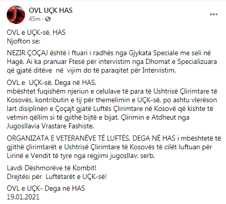 OVL e UÇK-së, Dega në HAS, mbështet fuqishëm njeriun e celulave të para të Ushtrisë Çlirimtare të Kosovës, kontributin e tij për themelimin e UÇK-së, po ashtu vlerëson lart disiplinën e Çoçajt gjatë Luftës Çlirimtare në Kosovë që kishte të vetmin qëllim si të gjithë bijtë e bijat, Çlirimin e Atdheut nga Jugosllavia Vrastare Fashiste.