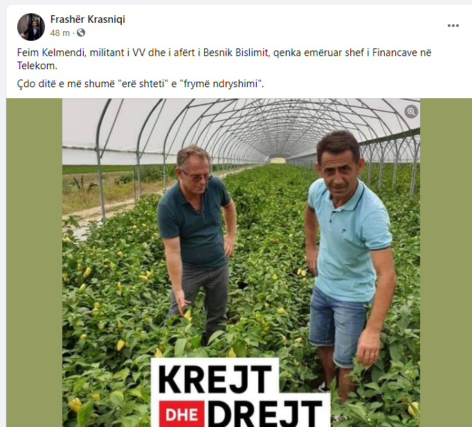 “Feim Kelmendi, militant i VV dhe i afërt i Besnik Bislimit, qenka emëruar shef i Financave në Telekom. Çdo ditë e më shumë ‘erë shteti’ e ‘frymë ndryshimi’”, ka shkruar Krasniqi në Facebook.