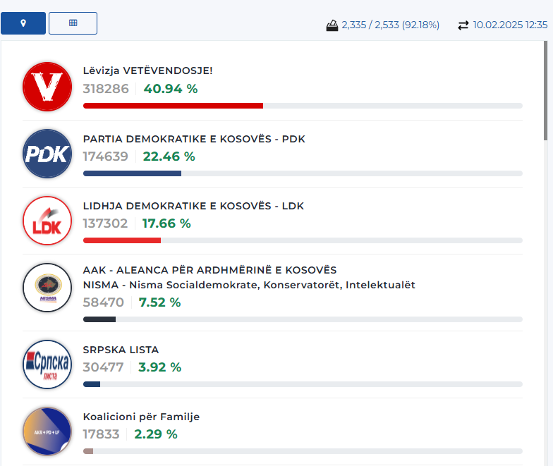 Me 92.18% të votave të numëruara, LVV tani ka 40.94% të votave, e ndjekur nga PDK me 22.46%.LDK renditet e treta me 17.66%, kurse AAK e katërta me 7.52%.