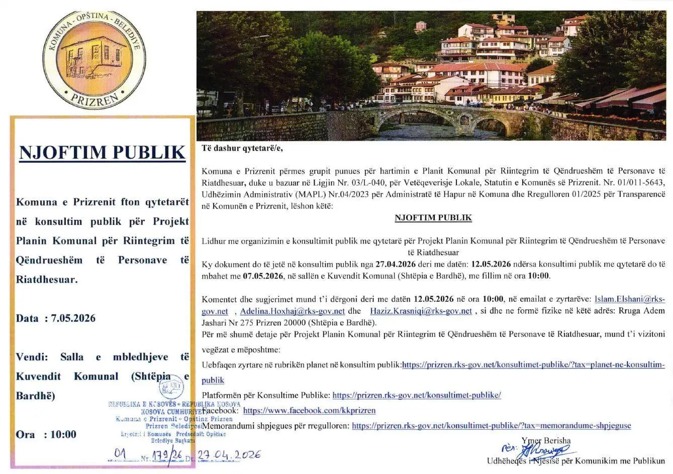 Siç bëhet e ditur, ky dokument do të jetë në konsultim publik nga 27.04.2026 deri më 12.05.2026, ndërsa konsultimi publik me qytetarë do të mbahet të enjten, më 07.05.2026 në sallën e Kuvendit Komunal (Shtëpia e Bardhë), në orën 10:00.