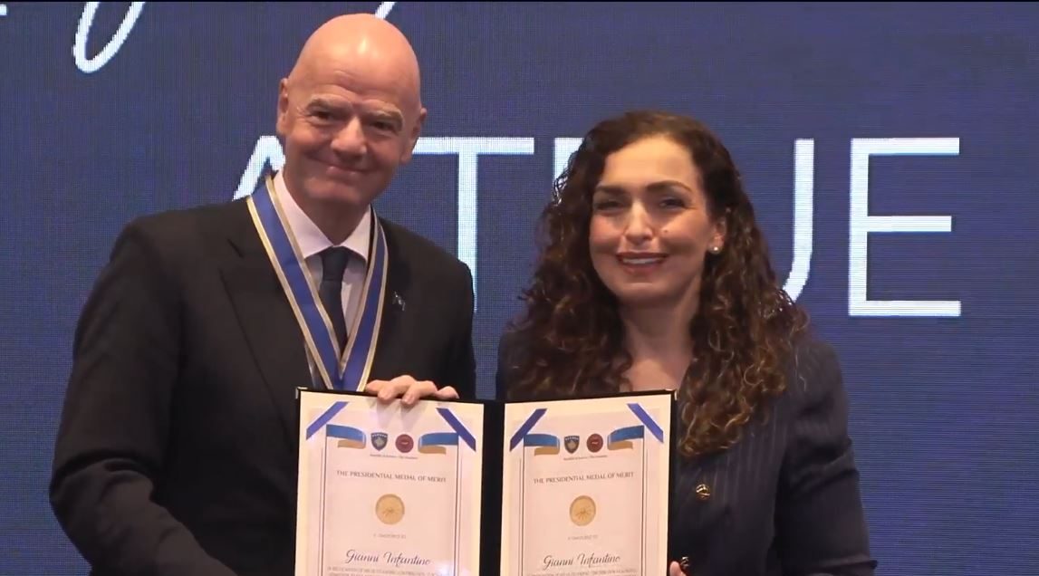 Presidenti i FIFA-s, Gianni Infantino, është dekoruar nga presidentja e Kosovës, Vjosa Osmani, me Medaljen e Nderit të Kosovës.