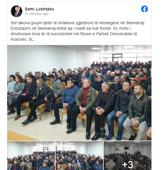 Postimi i tij i plotë:Sot takova grupin tjetër të shtabeve zgjedhore të nëndegëve në Skenderaj. Entuziazmi në Skenderaj është aq i madh sa nuk thuhet. Ky motiv i strukturave tona do të kurorëzohet me fitoren e Partisë Demokratike të Kosovës. SL