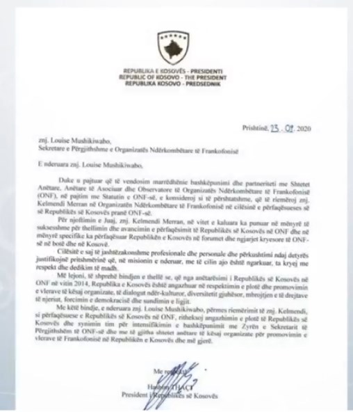 “Për njoftimin Tuaj, znj. Kelmendi Merran, në vitet e kaluara ka punuar në mënyrë të suksesshme për thellimin dhe avancimin e përfaqësimit të Republikës së Kosovës në ONF dhe në mënyrë specifike ka përfaqësuar Republikën e Kosovës në forumet dhe ngjarjet kryesore të ONF-së në botë dhe në Kosovë”, thuhet në shkresën e Thaçit që mban datën 23 shtator. “Cilësitë e saj të jashtëzakonshme profesionale dhe personale dhe përkushtimi ndaj detyrës justifikojnë pritshmërinë që misionin e nderuar me të cilin ajo është ngarkuar, ta kryejë me respekt dhe dedikim të madh”, thuhet në njoftim.