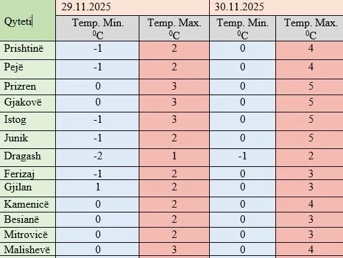 Të shtunën, 29 nëntor, parashihet të mbajë mot kryesisht i vranët dhe vende-vende me riga shiu të përziera me borë e në viset e larta reshje bore. Temperaturat minimale do të lëvizin ndërmjet -2 deri 0 gradë celsius, ndërsa maksimalet e ditës parashihen të lëvizin ndërmjet 1-3gradë celsius.