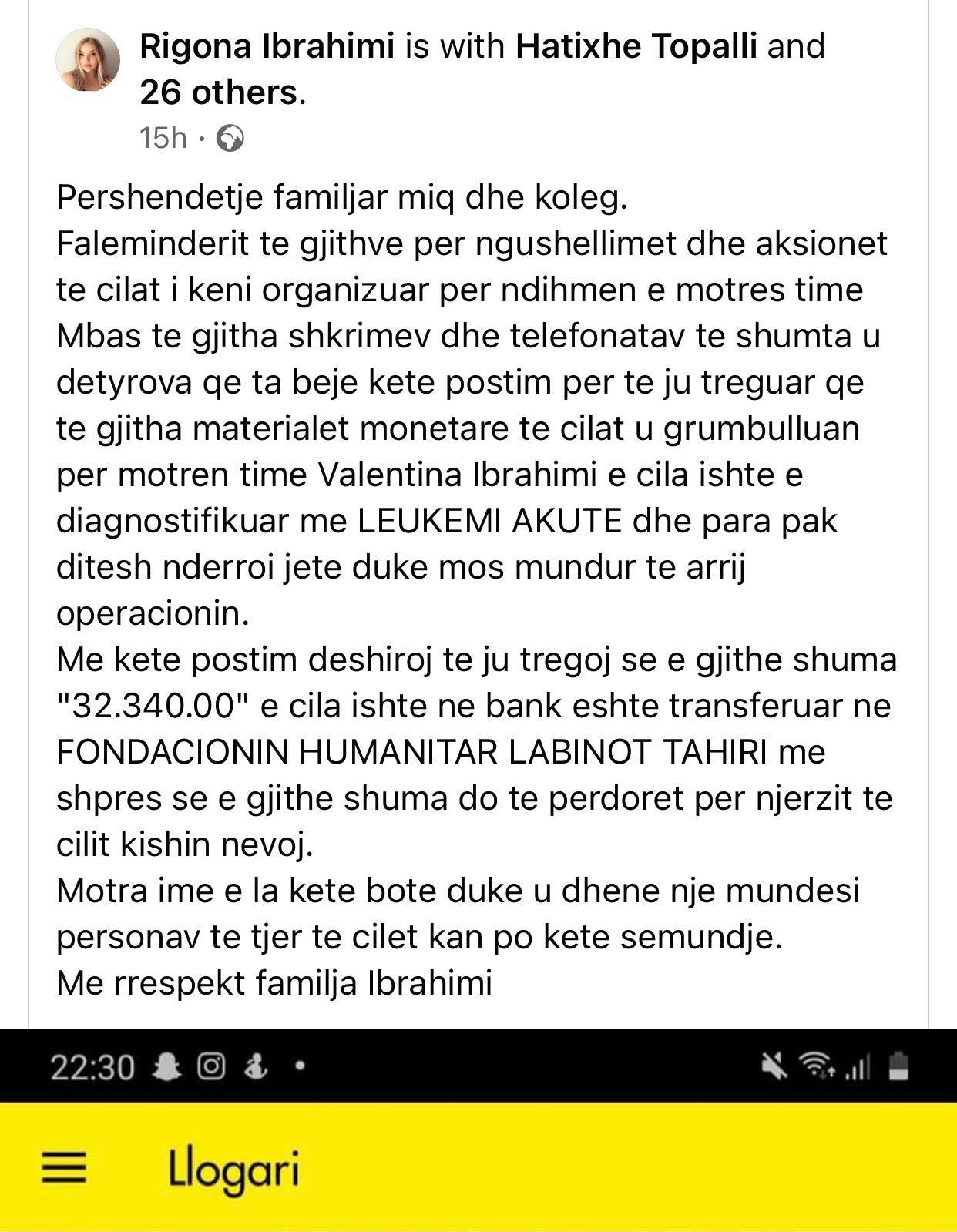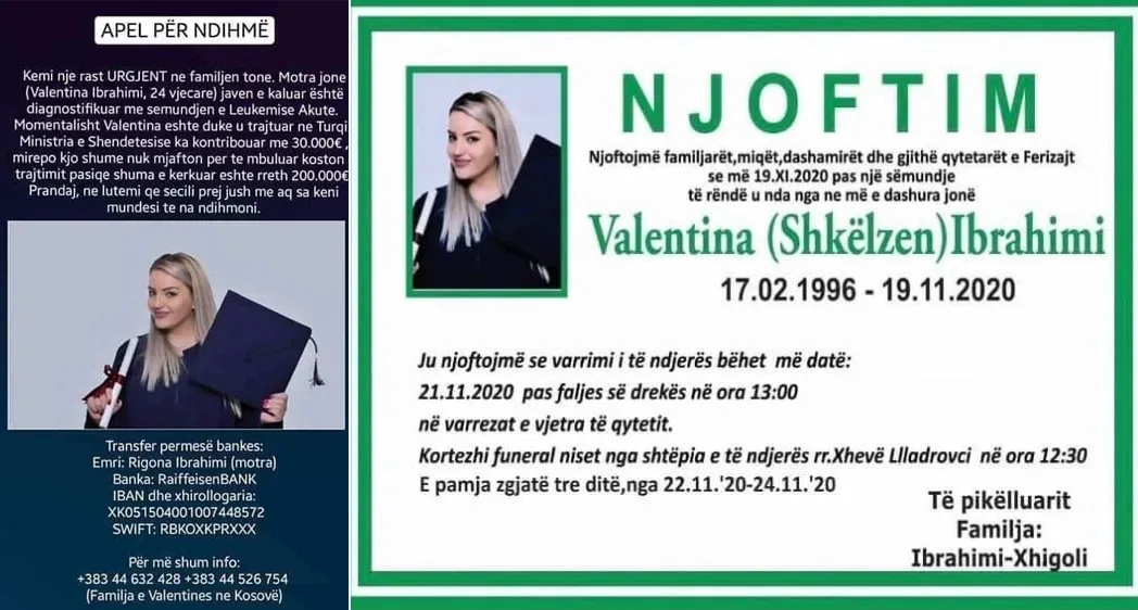 Mbas te gjitha shkrimev dhe telefonatav te shumta u detyrova qe ta beje kete postim per te ju treguar qe te gjitha materialet monetare te cilat u grumbulluan per motren time Valentina Ibrahimi e cila ishte e diagnostifikuar me LEUKEMI AKUTE dhe para pak ditesh nderroi jete duke mos mundur te arrij operacionin.
