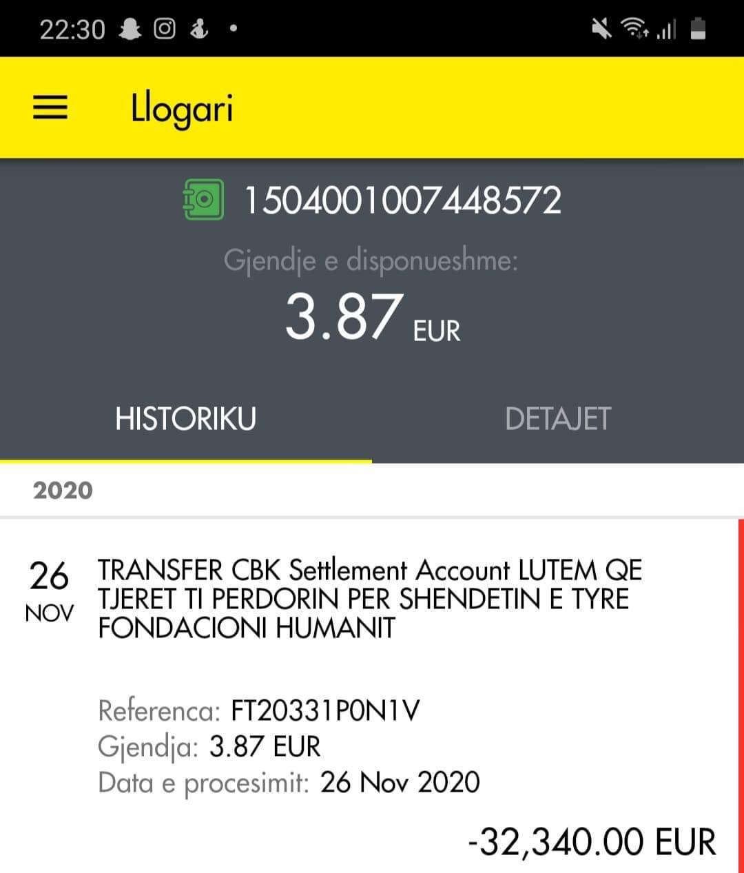Me kete postim deshiroj te ju tregoj se e gjithe shuma “32.340.00” € e cila ishte ne bank eshte transferuar ne FONDACIONIN HUMANITAR LABINOT TAHIRI me shpres se e gjithe shuma do te perdoret per njerzit te cilit kishin nevoj.