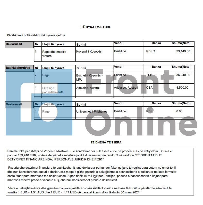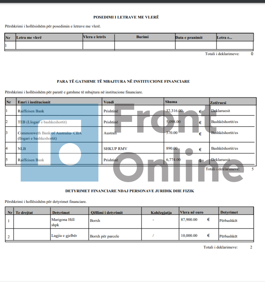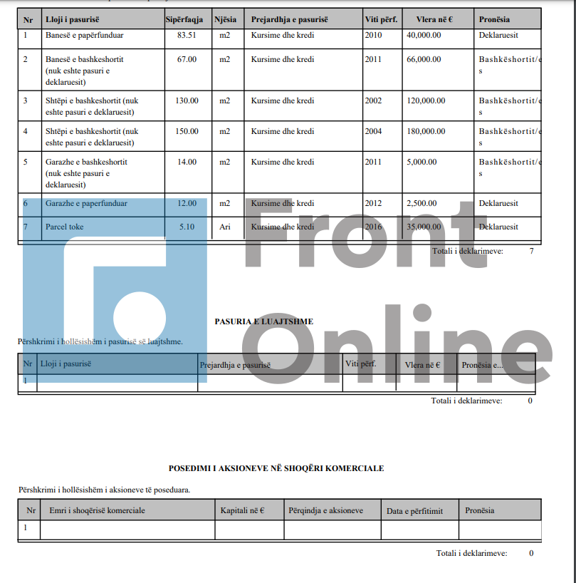 Më poshtë lista e deklarimit të pasurisë: