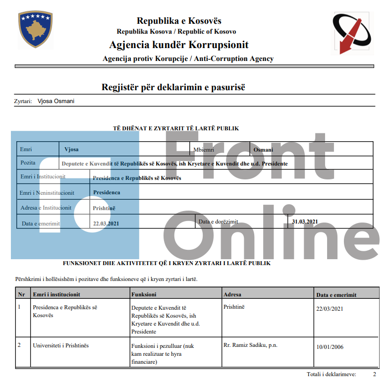 Në deklarimin e saj të pasurisë, Presidentja e Kosovës, Vjosa Osmani po del të jetë shumë e pasur.