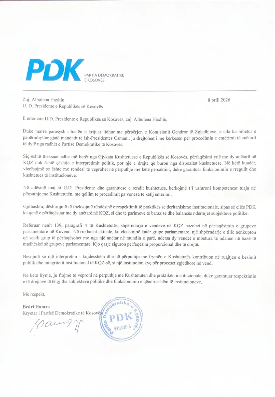 Në letrën e PDK-së gjithashtu theksohet rëndësia e respektimit të praktikës së deritanishme institucionale, sipas së cilës PDK ka qenë e përfaqësuar me dy anëtarë në KQZ, si dhe ruajtja e parimeve të barazisë dhe balancës mes subjekteve politike.