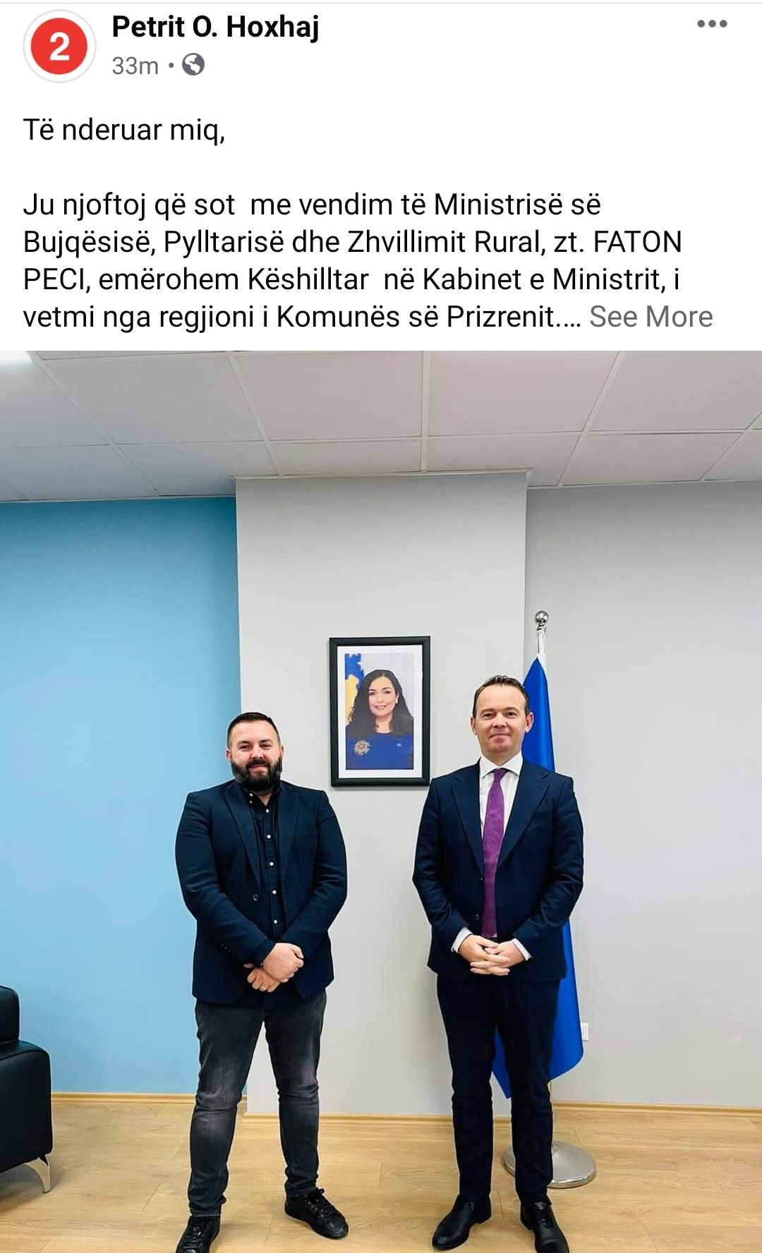 Ju njoftoj që sot me vendim të Ministrisë së Bujqësisë, Pylltarisë dhe Zhvillimit Rural, zt. FATON PECI, emërohem Këshilltar në Kabinet e Ministrit, i vetmi nga regjioni i Komunës së Prizrenit.