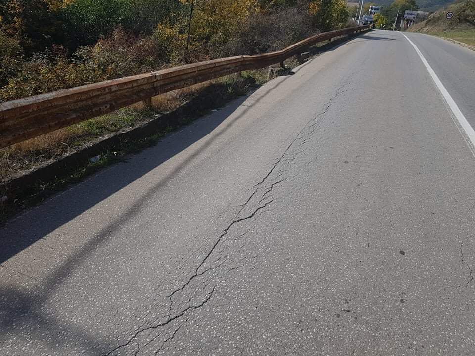 Një lexues ka dërguar disa fotografi ku shihet se si kjo rrugë ka pësuar plasaritje dhe shembje të asfaltit dhe anësoreve.