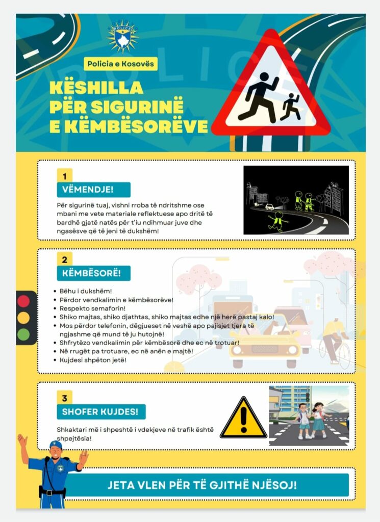 Policia e Kosovës përmes një njoftimi u ka bërë thirrje këmbësorëve që të respektojnë rregullat e trafikut, duke u kujdesur kështu për sigurinë e vetes.“Për sigurinë tuaj, vishni rroba të ndritshme ose mbani me vete materiale reflektuese apo dritë të bardhë gjatë natës, për t’iu ndihmuar juve dhe ngasësve që të jeni të dukshëm!”, thuhet në njoftimin e policisë, përcjell TV Prizreni..
