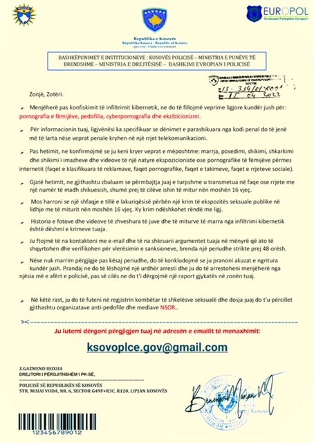 “Shpërndarja e këtyre e-mailave, kinse janë e-maila zyrtarë të lëshuar në emër të PK-së, i cili përmban logo të PK-së, logo qeveritare, vula të ndryshme dhe një mbishkrim të EUROPOL-it, kinse janë lëshuar me qëllim të njoftimit të palës së caktuar për veprime ligjore, nuk është dokument zyrtar i Policisë së Kosovës, e aq më pak i lëshuara nga drejtori i PK-së, por janë e-maila me dokument të falsifikuar për përdorim me qëllime të caktuara”, thuhet ndër tjera në njoftimin e tyre.