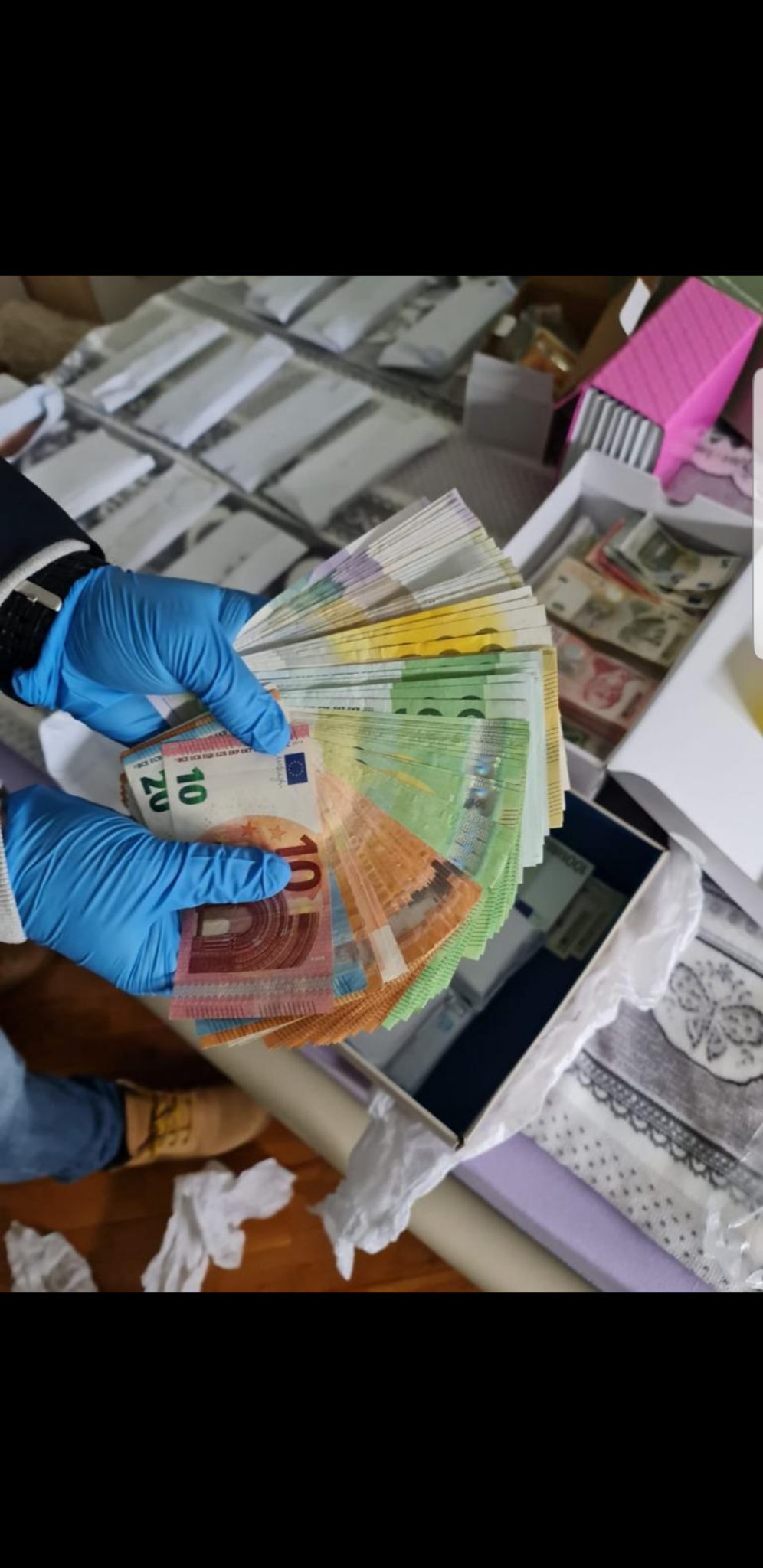 Franka Zvicerane: 100Kruna Suedeze: 300Gjithashtu janë sekuestruar edhe tri fletore ku dyshohet se i dyshuari ka mbajtur shënime në lidhje me shitjen e substancave narkotike.Vlera e parave të konfiskuara tejkalon 135 mijë e 800 €uro (mbi 135.800.00 €), përderisa i dyshuari me inicialet (N. P.) është arrestuar dhe me vendim të prokurorit dërgohet në mbajtje për procedura të mëtejme ligjore.