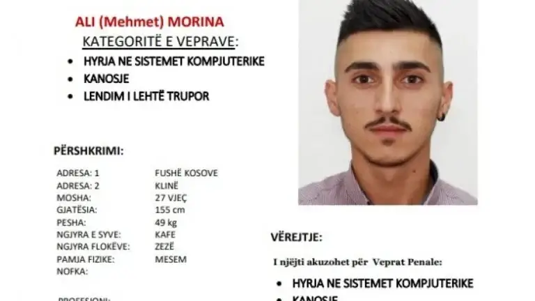 “Ali Mehmet Morina i lindur me 04.08.1993 nё fshatin Dresnik- Klinë, është i akuzuar për veprat penale:“HYRJE NE SISTEMET KOMPJUTERIKE”, “KANOSJE” dhe “LËNDIM I LEHTË TRUPOR””, thuhet në njoftim.