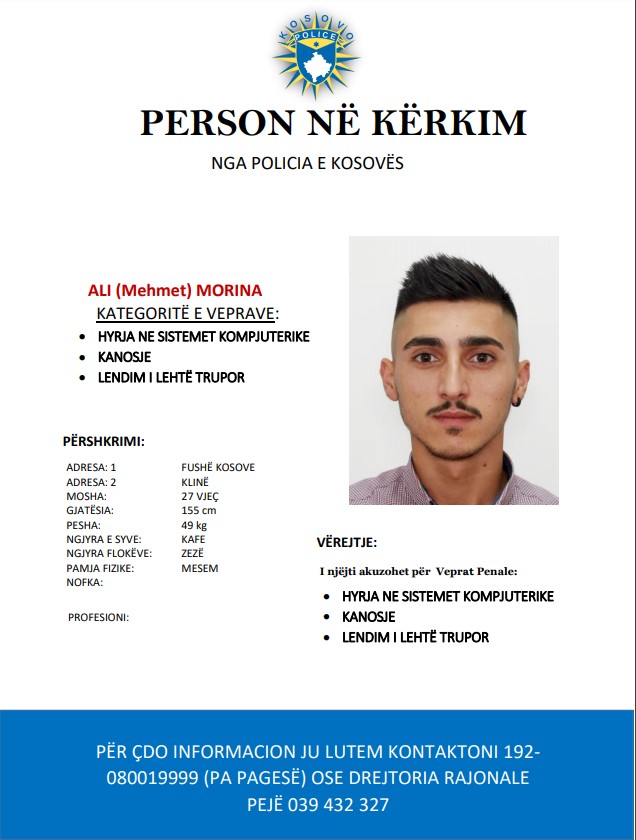 Policia e Kosovës-Drejtoria Rajonale e Policisë në Pejë, bazuar në ligj për publikimin e fotos me shënime tjera të personit të kërkuar më autorizim të Prokurorisë Themelore nё Pejё, ka lëshaur një kërkesë për bashkëpunim me qytetarët për arrestimin e Ali Mehmet Morinës nga fshati Dresnik i Klinës.