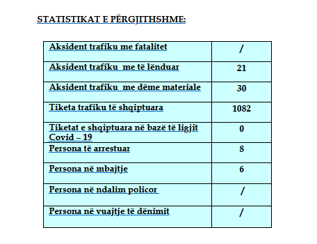 Sipas policisë, gjatë kësaj periudhe kohore janë evidentuar disa aksidente në trafikun rrugor, ku 21 aksidente kanë qenë me lëndime, ndërsa 30 me dëme materiale.
