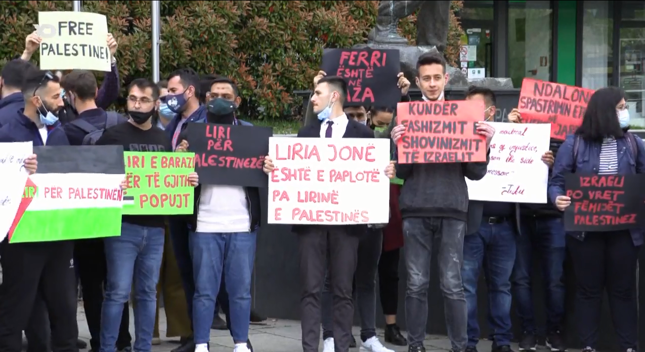 Disa qytetarë kanë dalur për të marshuar me pankarata “Free Palsestine”, “Liria jonë nuk është e plotë pa lirinë e popullit palestinez” e pankarta të tjera të ngjashme.