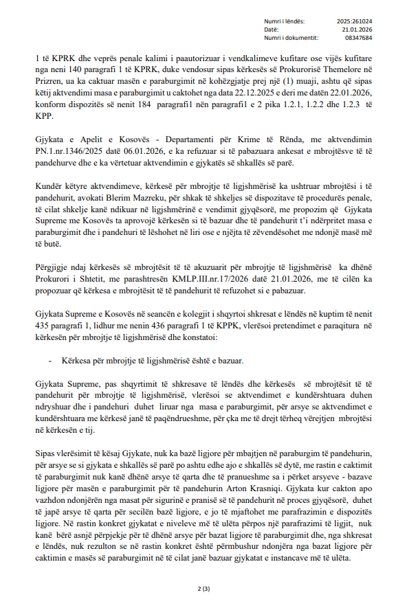 Kolegji penal i Gjykatës Supreme ka aprovuar kërkesën për mbrojtje të ligjshmërisë të Krasniqit dhe ka ndryshuar aktvendimet e mëparshme të Gjykatës Themelore në Prizren dhe Gjykatës së Apelit të Kosovës – Departamenti për Krime të Rënda, të cilat kishin caktuar paraburgimin ndaj tij.