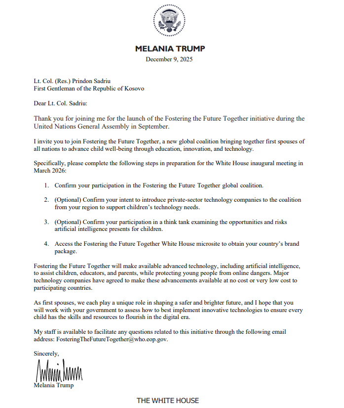 “Samiti do t’i dedikohet iniciativës së Zonjës së Parë Melania Trup ‘Fostering the Future Together’, të cilës Kosova iu bashkua në shtator 2025.”- thuhet mes tjerash në njoftimin e Presidencës.