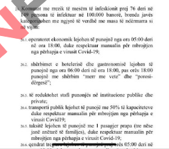 – operatorët ekonomik lejohen të punojnë nga ora 5:00 deri në ora 18:00, duke respektuar manualin për mbrojtje nga përhapja e Covid-19;