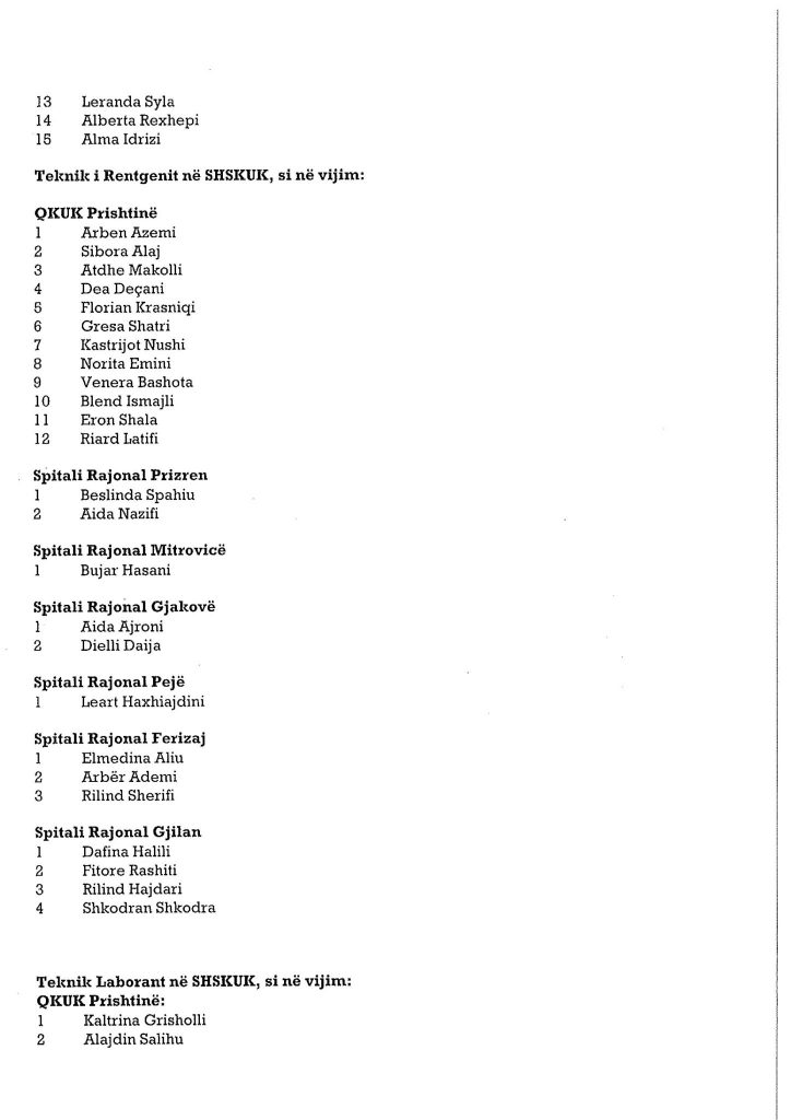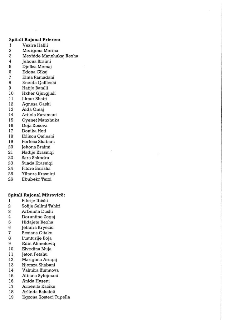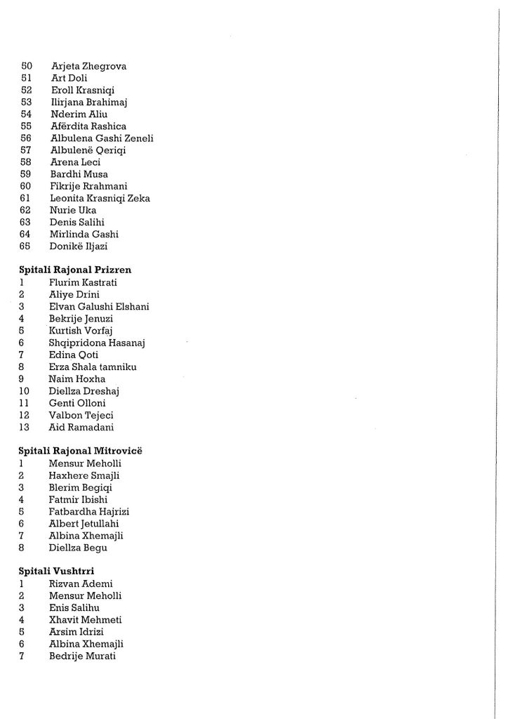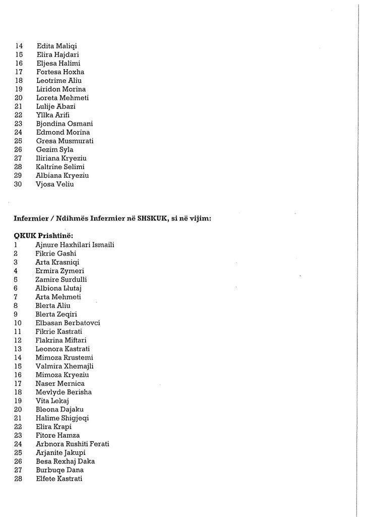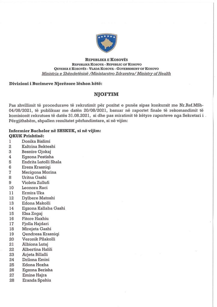 Ministria e Shëndetësisë ka bërë publike emrat e personave të cilët janë pranuar në listat për infermier në Shërbimin Spitalor dhe Klinik Universitar të Kosovës dhe spitalet e komunave.Angazhimi i këtij stafi është bërë për të përballuar situatën e rëndë shëndetësore në të cilën po kalon Kosova.Muaji gusht është përcjellë me numër të lartë të infektimeve.