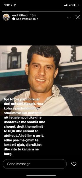 “Një foto e papublikuar deri më tani e babit. Nga koha e përfundimit të studimeve kur punonte në ilegalen politike dhe ushtarake me shokët dhe shoqet, drejt themelimit të UÇK dhe çlirimit të atdheut. Ai qëllim u arrit, edhe pse me çmim të lartë në gjak, djersë, lot dhe vite të kaluara në burg”, ka shkruar ai.