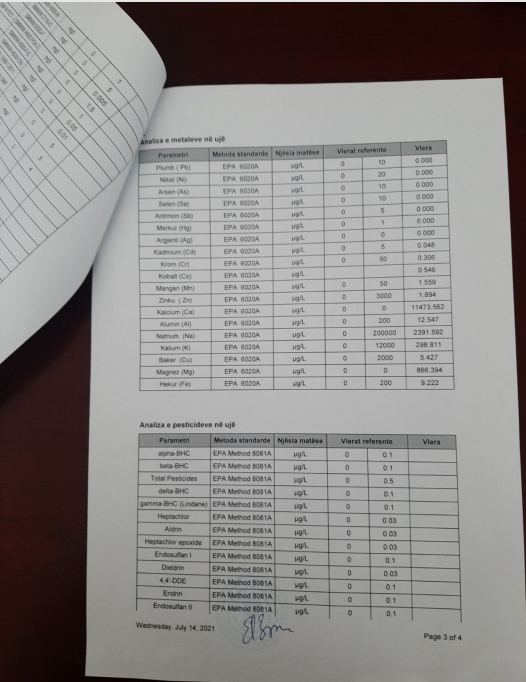 Rezultateteve e analizave në fjalë janë nga mostrat e nxjerra nga IKSHPK, saktësisht në ditën e situatës së krijuar në Deçan më 11.07.2021, të cilat mund t’i shihni më poshtë.KRU-Hidrodrini ndër të tjerash ka kërkuar nga IKSHPK që të dërgoi edhe analiza të tjera të bunarëve dhe të rrjetit si dhe të merret analiza e cila nuk është marrë, ajo në rezervuarin e Drenocit të përsëritet, meqë ajo është marrë në gypin e shpërlarësit në mënyrë që të sqarohet opinioni.