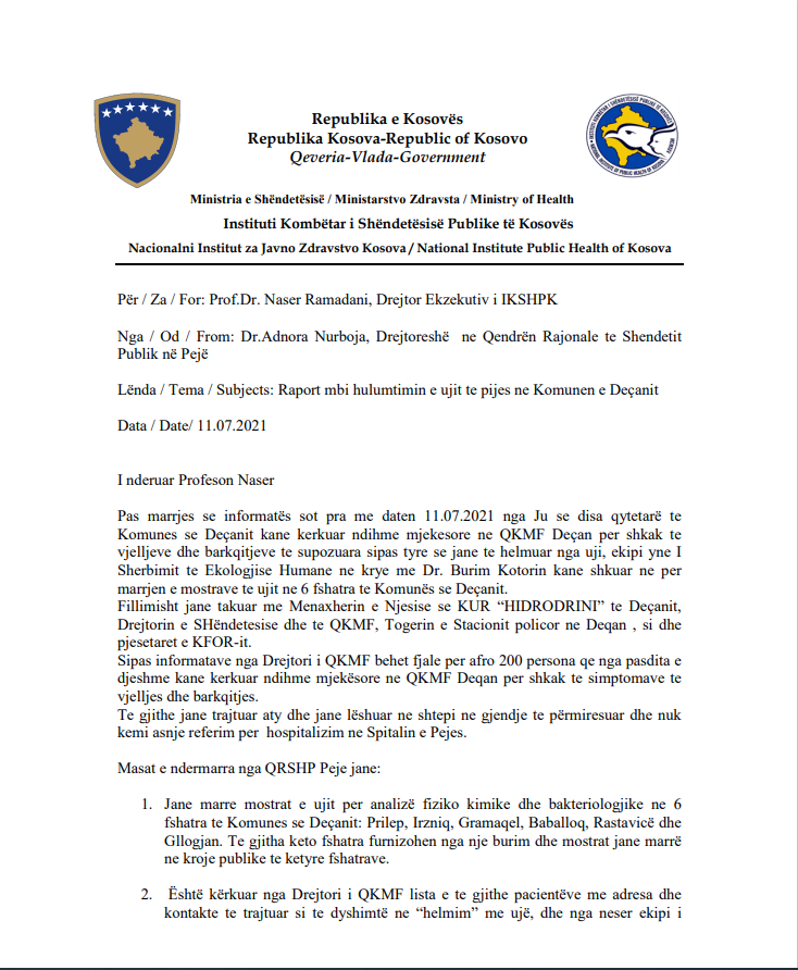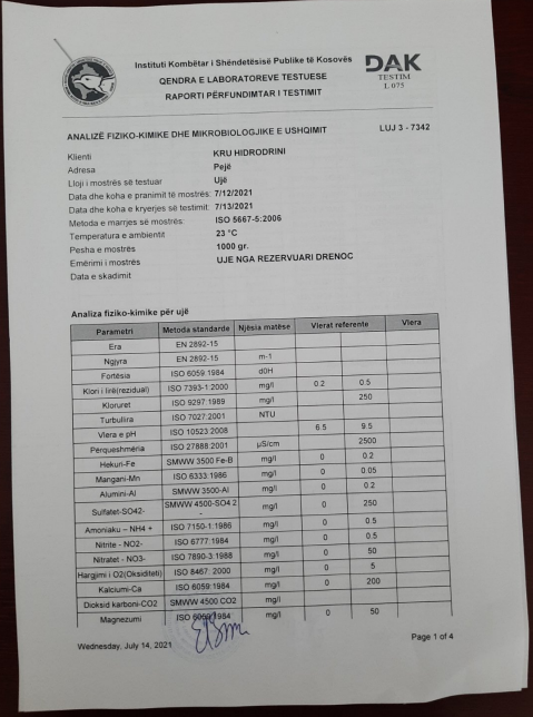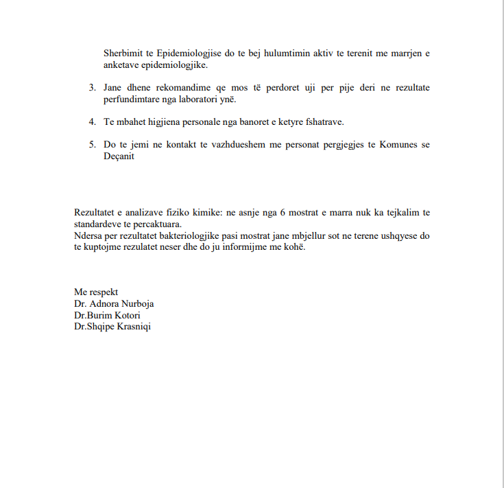 “KRU ‘Hidrodrini’ ka pranuar zyrtarisht nga IKSHPK, rezultatet e analiza kimiko-fizike, bakterologjike dhe të metaleve të rënda, nga mostrat e mara nga ana e IKSHPK-së, në lokalitetet e dyshuara fillimisht për ujë të helmuar në zonën e Deçanit.