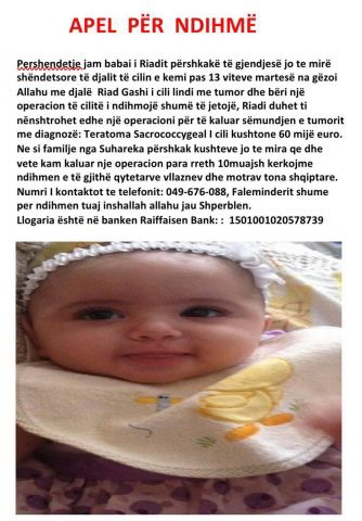 Riadi 10 muajsh nga Suhareka i diagnostifikuar me tumor ka nevojë për ndihmë financiare