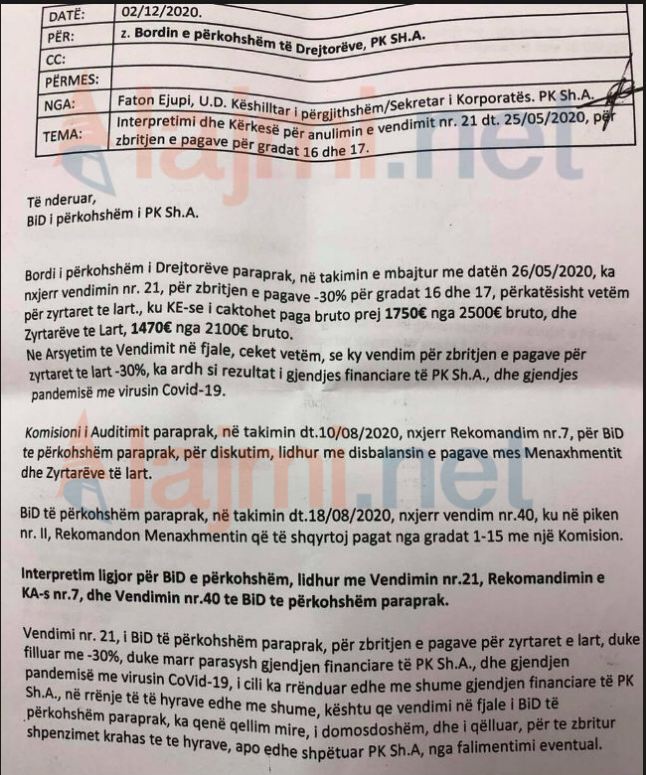 Ndonëse Bordi i kaluar i Postës për shkak të gjendjes së keqe financiare i kishte zbritur pagën zyrtarëve të lartë të kësaj ndërmarrje publike, bordi i ri ka marr vendim t’i rehatojë zyrtarët e lartë paga të majme. Se nga kush ka ardh ky propozim nuk thuhet në dokument.