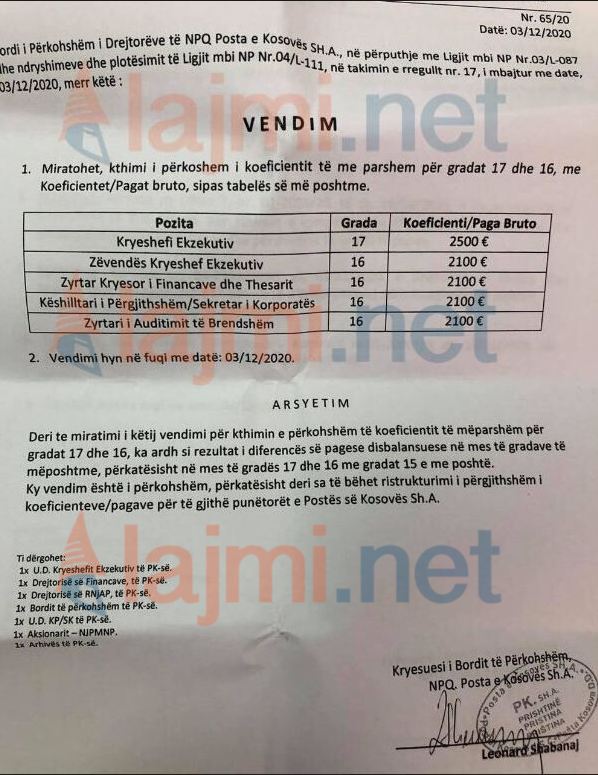 “Deri të miratimi i këtij vendimi për kthimin e përkohshëm të koeficientit të mëparshëm për gradat 17 dhe 16, ka ardhur si rezultat i diferencës së pagesës disbalansuese në mes të gradave të mëposhtme, përkatësisht në mes të gradës 17 dhe 16 me grada 15 e më poshtë. Ky vendim është i përkohshëm, përkatësisht deri sa të bëhet rikustruktimi i përgjithshëm i koeficienteve pagave për të gjithë punëtorët e Postës së Kosovës Sh.A”, thuhet në vendimin e nënshkruar nga kryesues i Bordit të Përkohshëm Leonard Shabanaj .