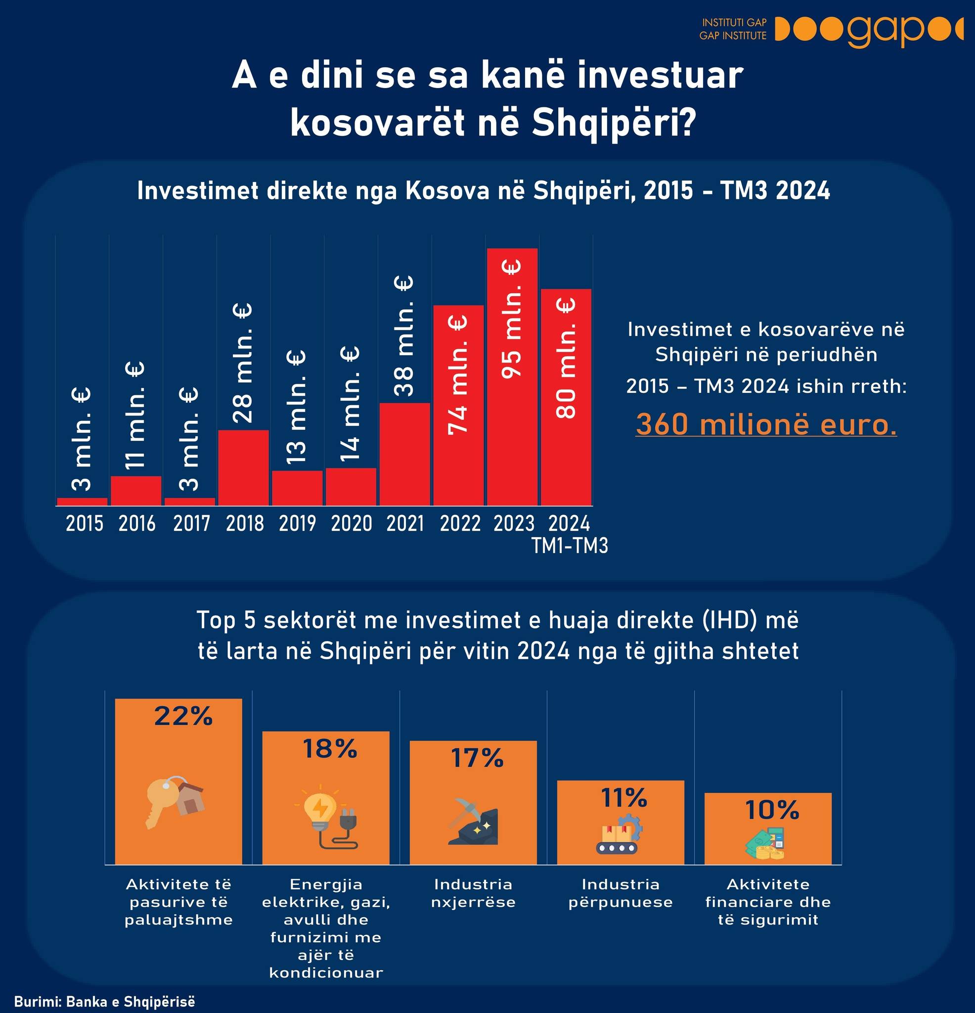 Instituti GAP ka publikuar sot një grafikë ku paraqiten investimet e shtetasve të Kosovës në Shqipëri.