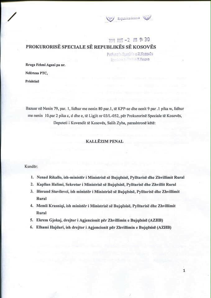 Deputeti i Kuvendit të Kosovës nga radhët e VV-së, Salih Zyba, dorëzoi kallëzimin penal për ish ministrat e Bujqësisë, Nenad Rikallo, Memli Krasniqi, Blerand Stavileci, sekretarin e Ministrisë së Bujqësisë, Halim Kapllani, drejtorin e Agjencisë së Zhvillimit të Bujqësisë, Ekrem Gjokaj dhe ish drejtorin e kësaj agjencie, Elhami Hajdari.