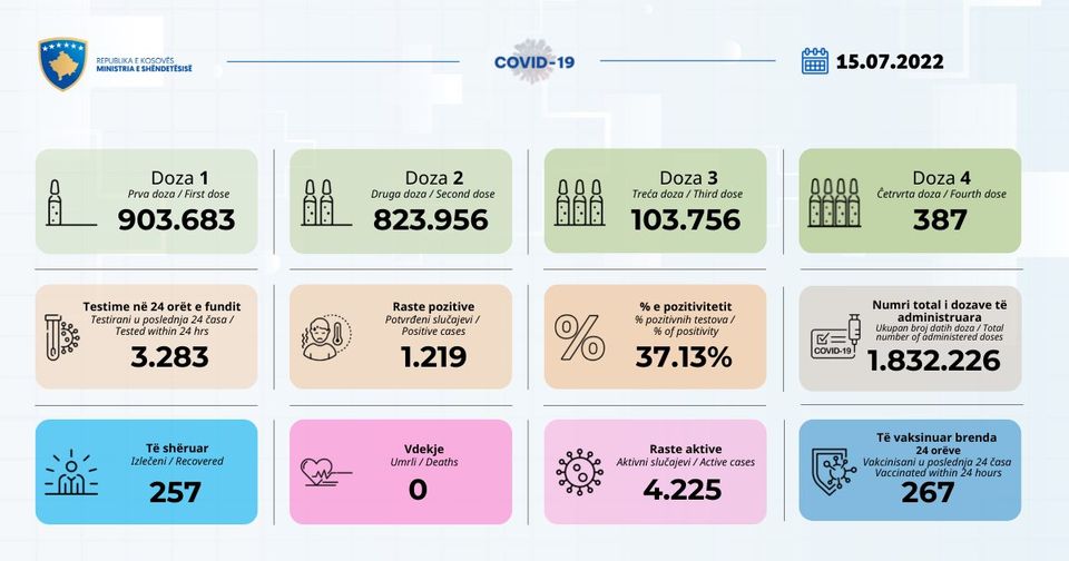 Ministria e Shëndetësisë më tej njofton se në 24 orët e fundit janë vaksinuar 267 persona, ndërsa në total numri i dozave të administruara është 1,832,226.