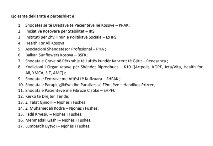 Në këtë letër ku janë të nënshkruar disa organizata kërkohet që të fillohet pa vonesë reforma në sistemin shëndetësor; të krijohet një sistem që prodhon të dhëna shëndetësore të krahasueshme ndërkombëtarisht, me fokus të veçantë në Sistem të Integruar të Informimit Shëndetësorë (SIISh), Kontabilitet Shëndetësor Kombëtarë (KoSh) dhe Raporte të standardizuara të punës për të gjitha institucionet shëndetësore; të hartohet strategjia kombëtare për shëndetësi (Të themelohet Komiteti Kombëtar për Shëndetësi i cili do të përbëhet nga të gjitha grupet e interesit, përfshi edhe shoqërinë civile).