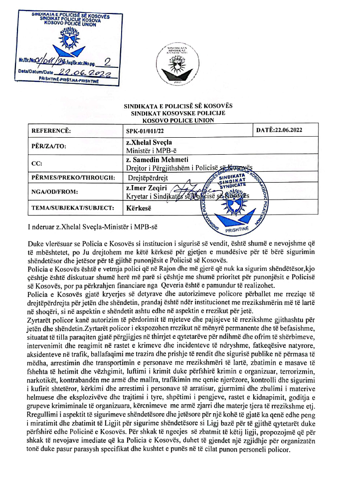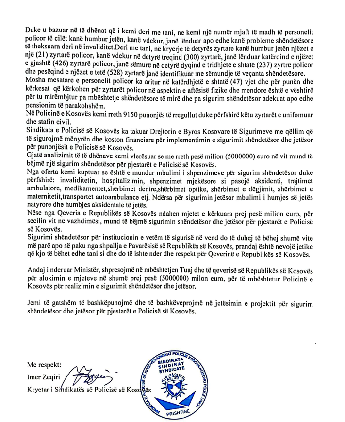 Sindikata e Policisë së Kosovës i ka dërguar një letër ministrit të Punëve të Brendshme, Xhelal Sveçla duke kërkuar 5 milionë euro për të realizuar projektin e sigurimeve shëndetësore për zyrtarët policor.