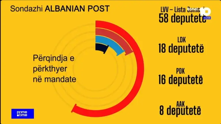 Në bazë të këtyre shifrave LVV do të merrte 58 mandate, LDK 18 mandate, PDK 16 mandate derisa AAK 8 mandate.