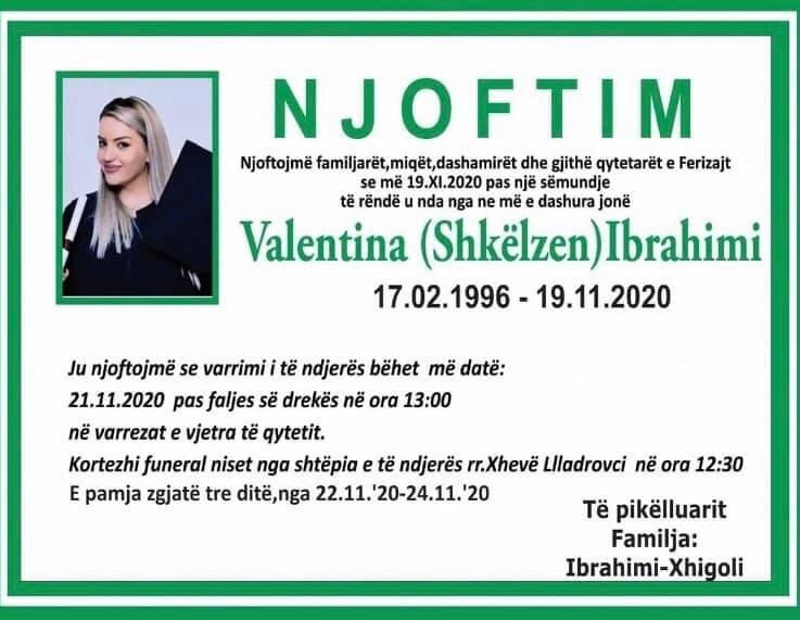 Nga familja e Valentinës është njoftuar se varrimi i saj do të bëhet sot në orën 13:00, pas faljes së drekës në varrezat e vjetra të qytetit të Ferizajt.