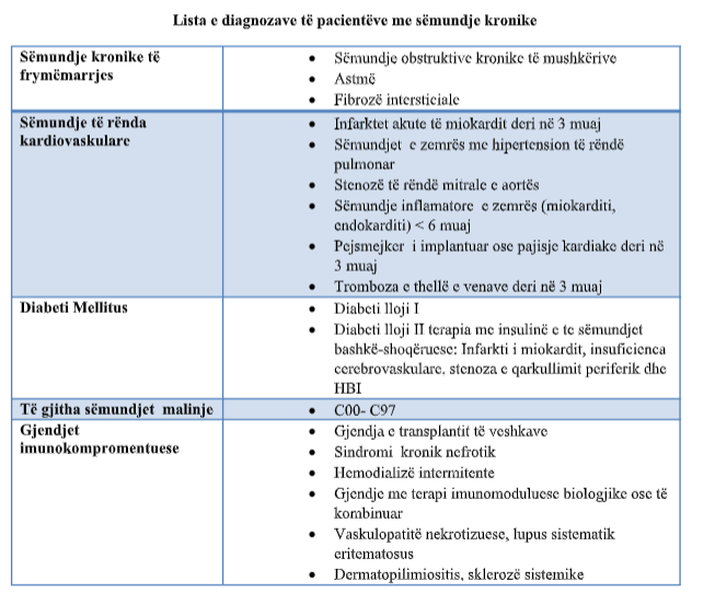 Komiteti për vaksinim kundër COVID-19 njofton se nga sot për disa ditë me radhë, në Prishtinë dhe në të gjitha komunat tjera si Prizreni, Gjilani, Ferizaj etj, do të fillojë vaksinimi i personave të moshës 75-79 vjeç me sëmundje kronike, sipas listës së diagnozave të pacientëve me sëmundje kronike, të dëshmuar me raport mjekësor me rastin e paraqitjes për vaksinim.