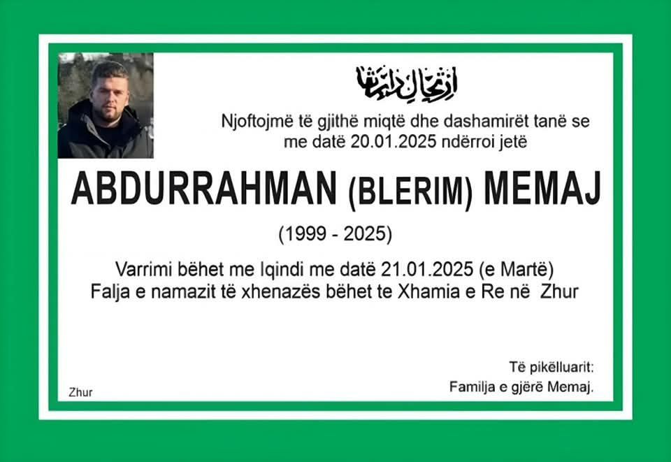Sot, më 21 janar 2025, në varrezat e fshatit Zhur do t’i jepet lamtumira e fundit Abdurrahman Memajt, i cili më 31 dhjetor 2024, nga shpërthimi i fishekzjarrëve në Prizren mori plagë të rënda e ku si pasojë nuk arriti t’i mbijetoj plagëve dhe më 20 janar 2025, ka ndërruar jetë në Turqi.
