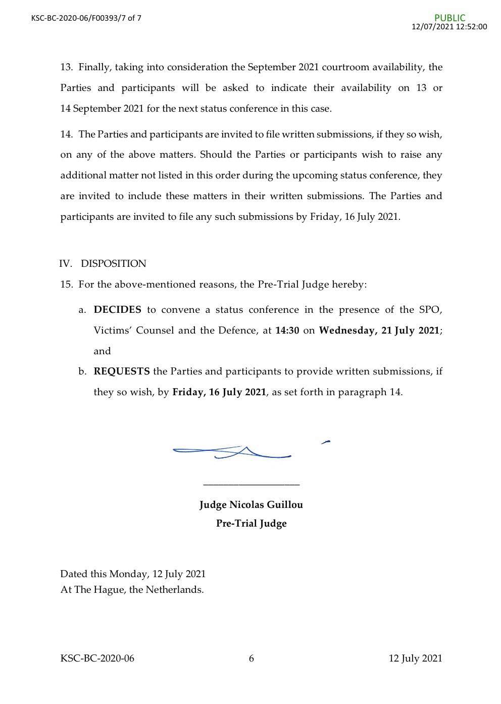 Palët e lartëpërmendura kanë të drejtë që deri me 16 korrik t’i dërgojnë parashtresat e tyre me shkrim, nëse dëshirojnë ta bëjnë këtë apo në të kundërtën argumentimet do t’i japin vetëm në seancë.