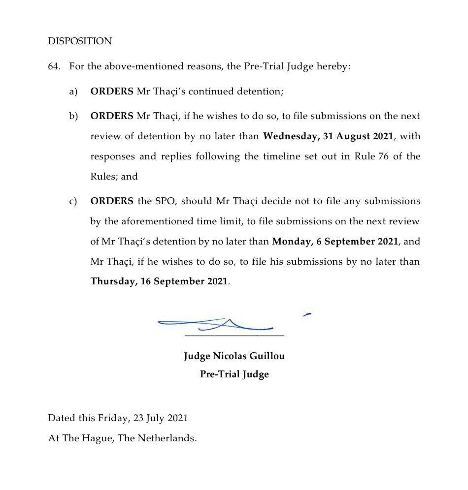 Në vendimin e tij të specifikuar, gjyqtari Guillou ka urdhëruar mbrojtjen e Thaçit që parashtresat në lidhje me rishikimin tjetër të paraburgimit t’i dërgojë deri më 31 gusht.