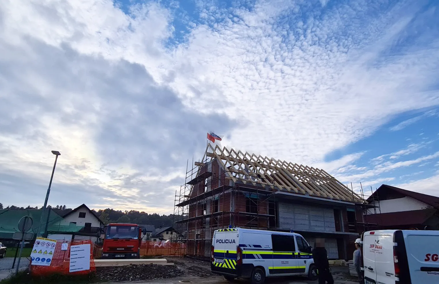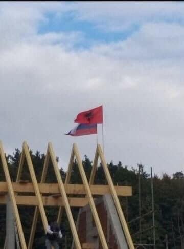 Ndërtuesi nga Suhareka vuri dy flamuj në çati në shenjë të bashkëjetesës dhe mirëkuptimit dhe natyrisht gëzimit, sepse ai po krijon një shtëpi të re në një mjedis miqësor në Naklo të Sllovenisë.