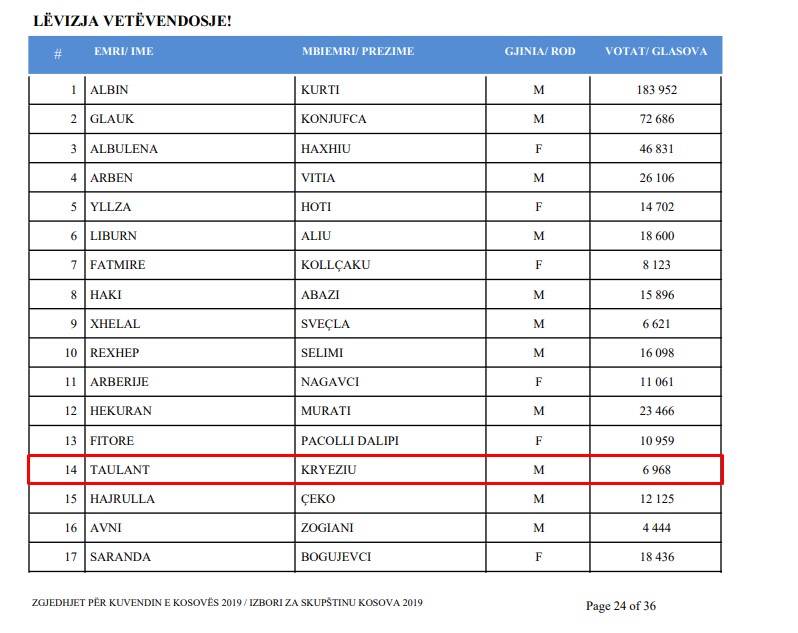 Sipas rezultateve preliminare nga ana e Komisioni Qendror Zgjedhor (KQZ), fitues i këtyre zgjedhjeve është kandidati nga Lëvizja Vetëvendosje, Shpejtim Bulliqi.