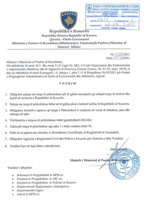 Në vendim thuhet se, obligohet pajisja me targa të përkohshme për të gjitha automjetet që mbajnë targa të Serbisë dhe hyjnë në territorin e Kosovës.