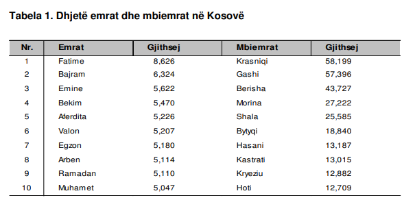 Në dhjetor të vitit 2017, Agjencia e Statistikave të Kosovës (ASK) kishte publikuar “Emrat dhe mbiemrat në Kosovë”. Të dhënat në këtë publikim ishin paraqitur sipas bazës së grumbullimit të të dhënave nga Regjistrimi i Popullsisë së Kosovës, i kryer në vitin 2011.