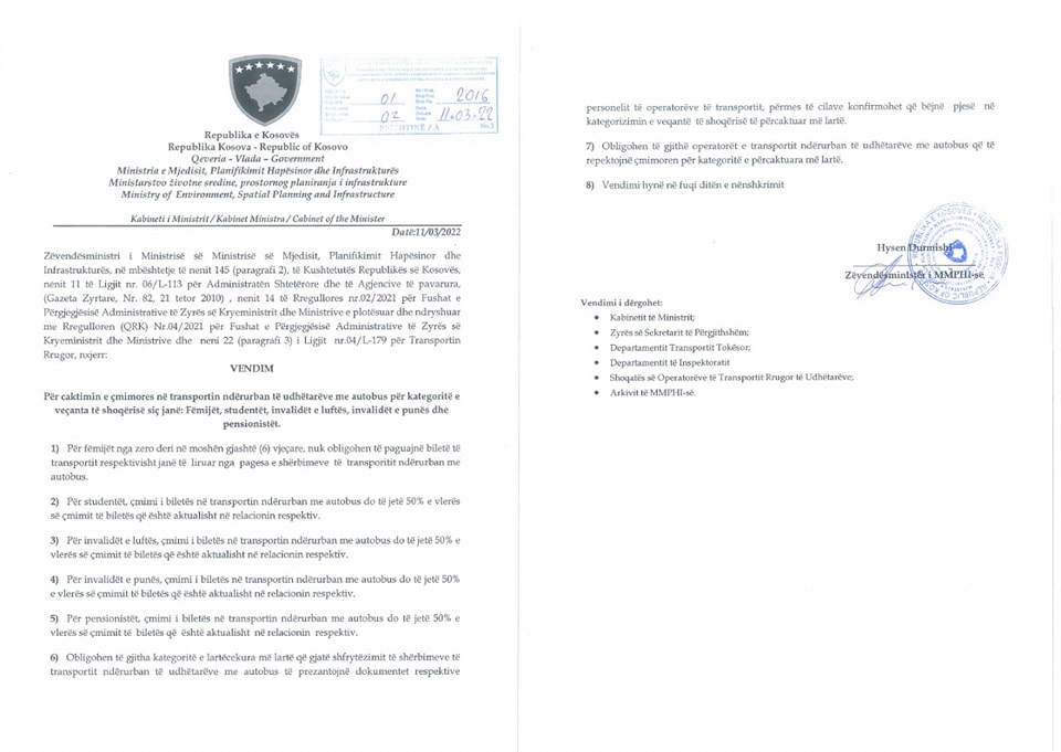 Zëvendësministri i Infrastrukturës, Mjedisit dhe Planifikimit Hapësinor, Hysen Durmishi, ka bërë të ditur se ka marrë vendim që çmimi i biletave të autobusit për disa kategori përgjysmohen nga çmimi aktual.