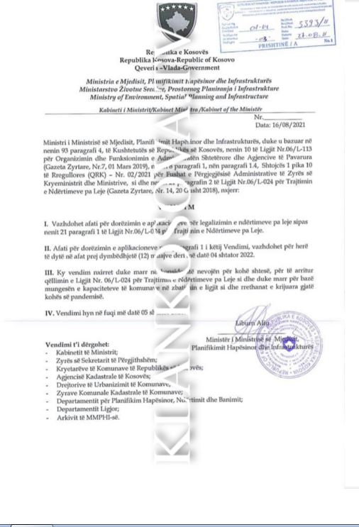 “Ky vendim nxirret duke marr në konsideratë nevojën për kohën shtesë, për të arritur qëllimin e Ligjit Nr. 06/L-024 për Trajtimin e Ndërtimeve pa Leje si dhe duke marr për bazë mungesën e kapaciteteve të komunave në zbatimin e ligjit si dhe rrethanat e krijuara gjatë kohës së pandemisë”, thuhet në dokumentin e ministrisë.