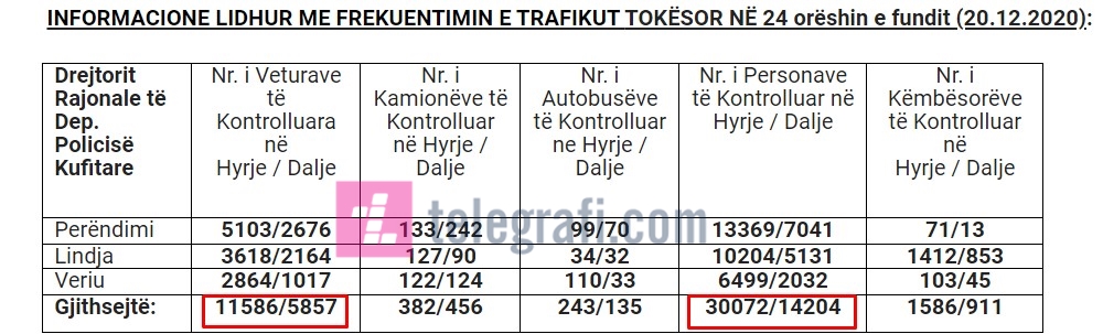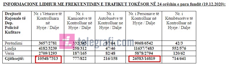 Sipas këtyre statistikave të shtunën më 19 dhjetor, në territorin e Kosovës përmes pikave kufitare kanë hyrë 26 mijë e 583 persona, kurse të dielën më 20 dhjetor kanë hyrë 30 mijë e 72 persona, e që në total i bie 55 mijë 655 persona, shkruan Telegrafi.